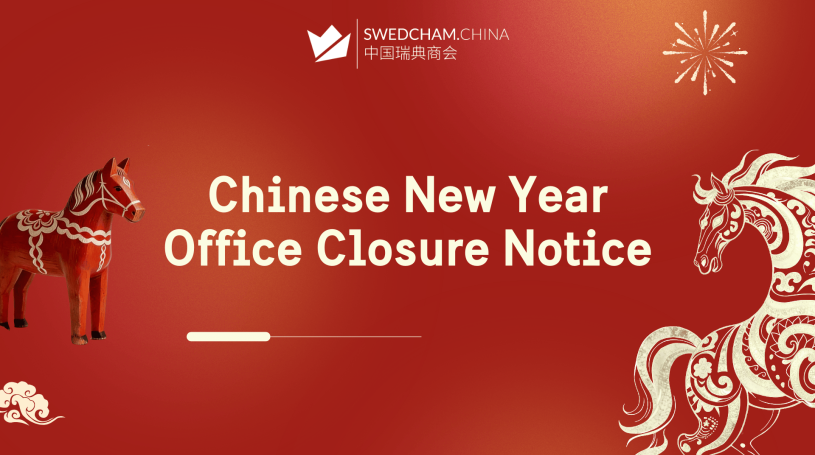 To celebrate the Chinese New Year, the Swedish Chamber of Commerce in China office will be closed from February 14th to February 23rd, 2026, and will resume normal office hours on February 24th, 2026.